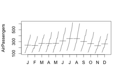 Rで時系列データの周期特性をちゃっと確認したいとき、monthplotという関数を使うとデータを月次に分割してグラフ作成してくれる。 monthplot(AirPassengers) が、出力がちょっとアレなのと 月次以外の周期性をみたい場合があるので、 ggplot2 で作ってみた…